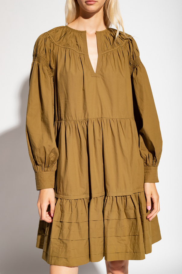 Khaki ‘Rosa’ dress from Ulla Johnson. Crafted from cotton, this loose-fitting V-neck design features long puff sleeves with buttoned cuffs, gathers, ruffles and two slip pockets.