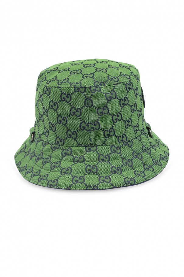 Green hat from Gucci, the ‘GG Multicolour’ collection. Made of cotton, this design features long straps and an embroidered logo pattern in black.