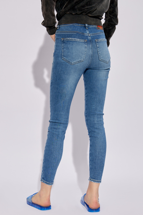 Blue ‘1984 SLANDY-HIGH’ jeans from Diesel. Fastened with a zip and button, this super skinny fit pair features a logo tag, three front pockets, two back pockets, tapered legs and a vintage effect.