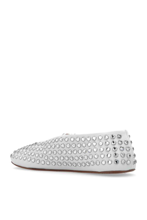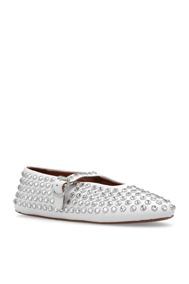 White ballet flats from Alaia. Made from lamb leather, this model sits on a black rubber sole flaunting the brand\'s signature pattern and showcases an adjustable buckle strap and crystal-bejewelled metal applications all over.