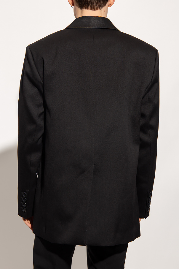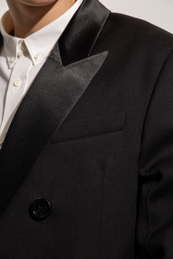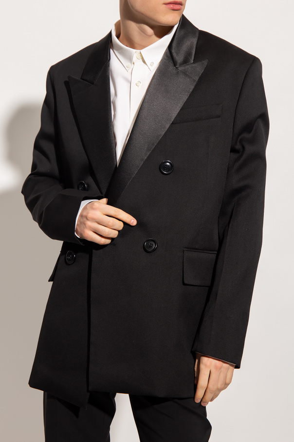 Black double-breasted blazer from Ami Alexandre Mattiussi. Crafted from wool, this garment features button fastenings, two flap pockets, one slip pocket, peak lapels with a satin finish, single rear vent and button cuffs.