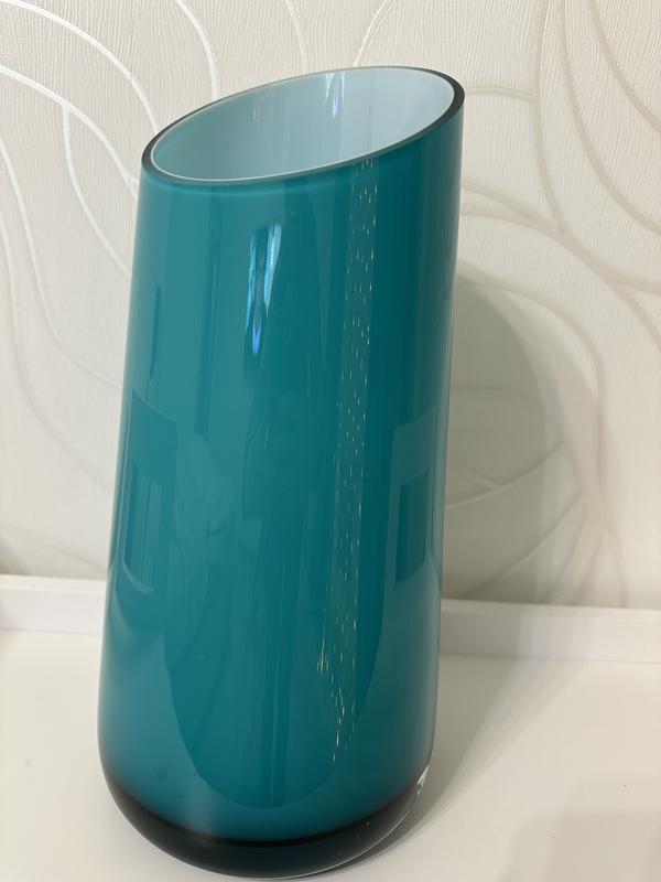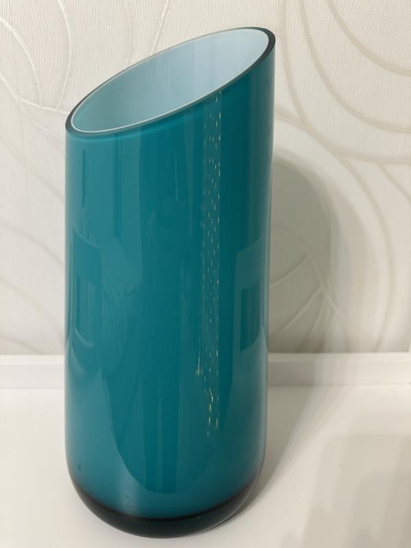 Ваза из стекла бирюзового цвета. Высота по бокам 27 см и 33 см. Диаметр низа ваз - 14 см, диаметр верха 12 см. Стан идеален.