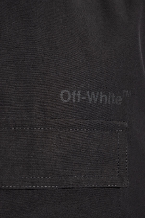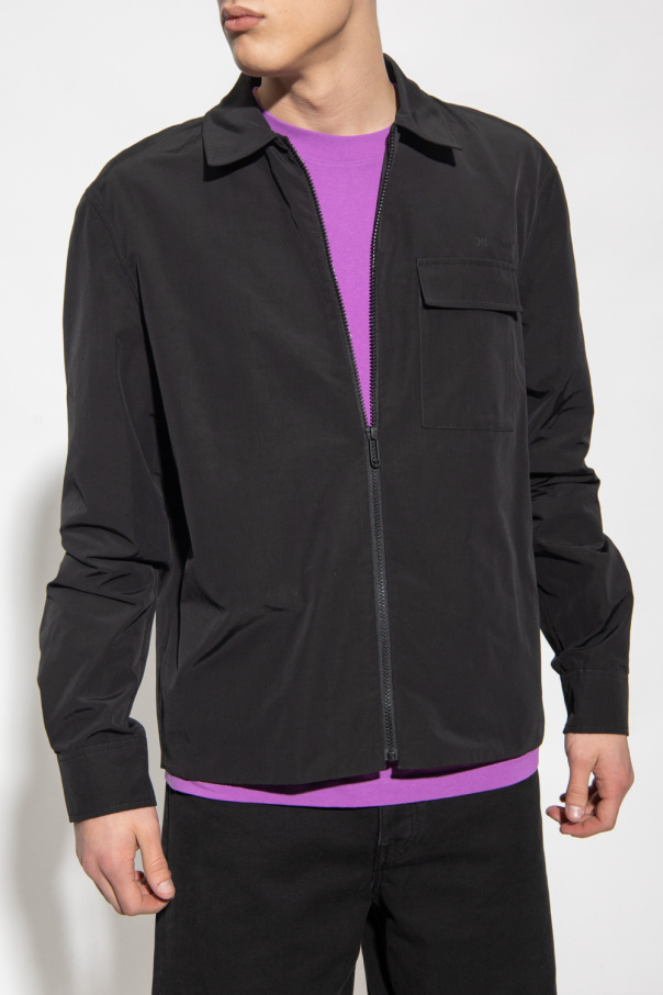 Black jacket from Off-White. Fastened with a zip, this long sleeve design features a black logo print and flap pocket.