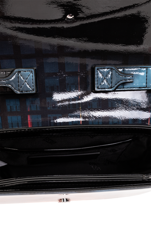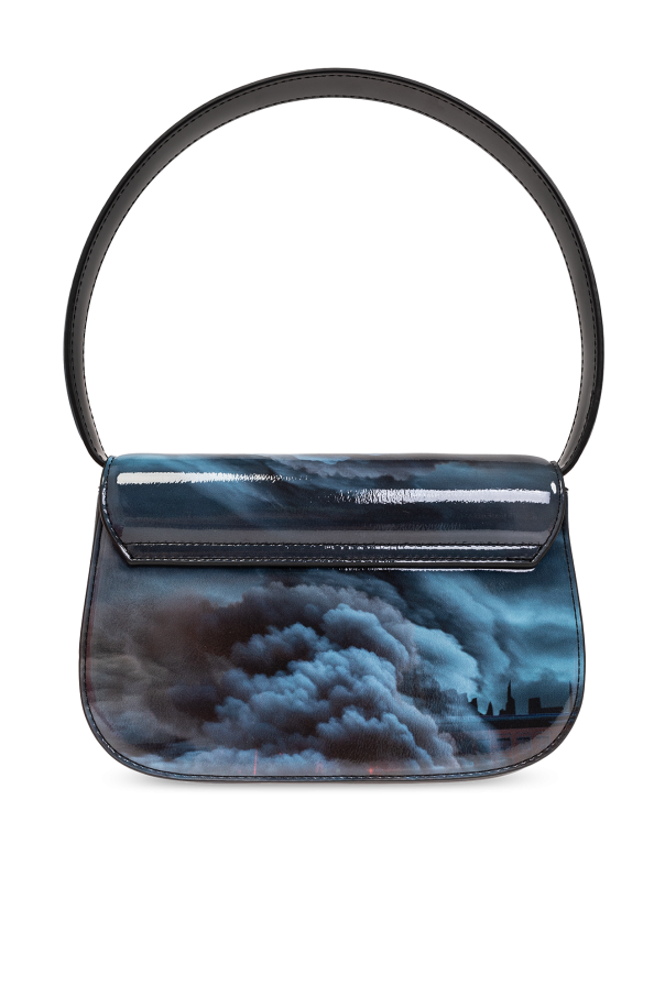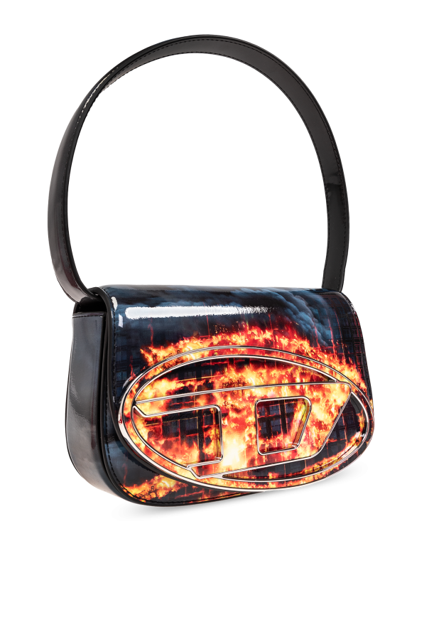 Blue and red ‘1DR’ shoulder bag from Diesel. Made from varnished material, this item fastens via a magnetic snap on the flap and showcases a graphic print with flames, logo application on the front, one half-round handle, silver-tone metal hardware as well as a detachable and adjustable shoulder strap and one internal compartment with two slip pockets.