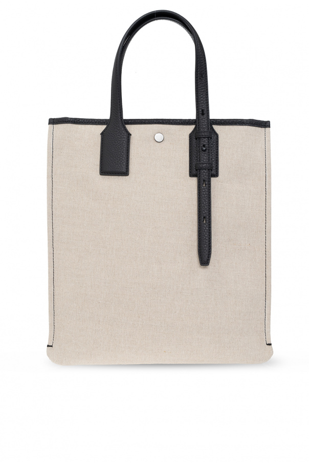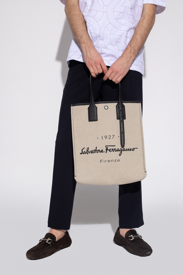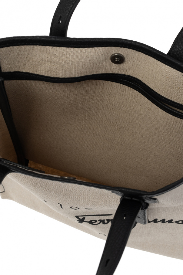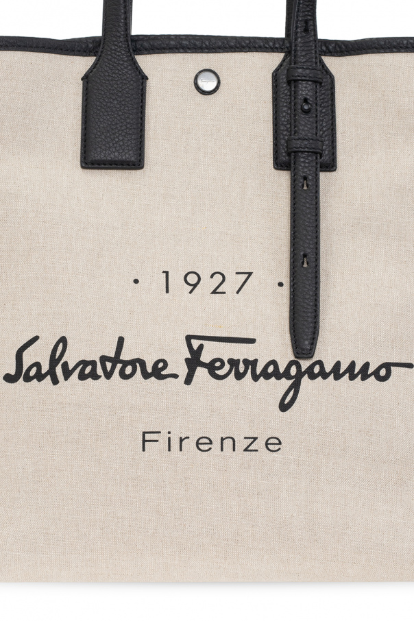 Light beige and black ‘Item’ shopper bag from Salvatore Ferragamo. Made of canvas with calf leather trims, this design features a snap closure, black logo print, two adjustable half-round handles, one internal compartment and silver-tone metal hardware.