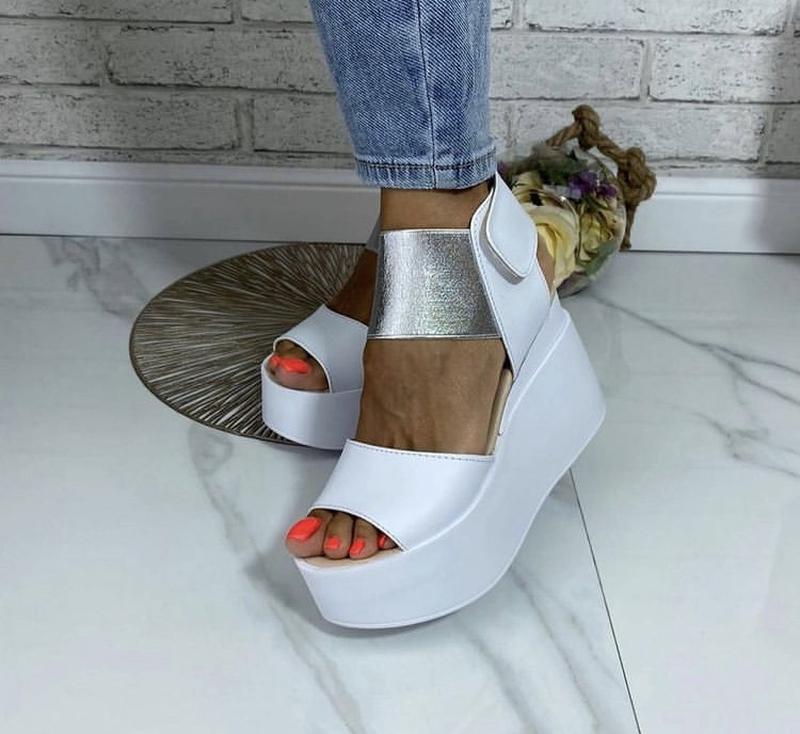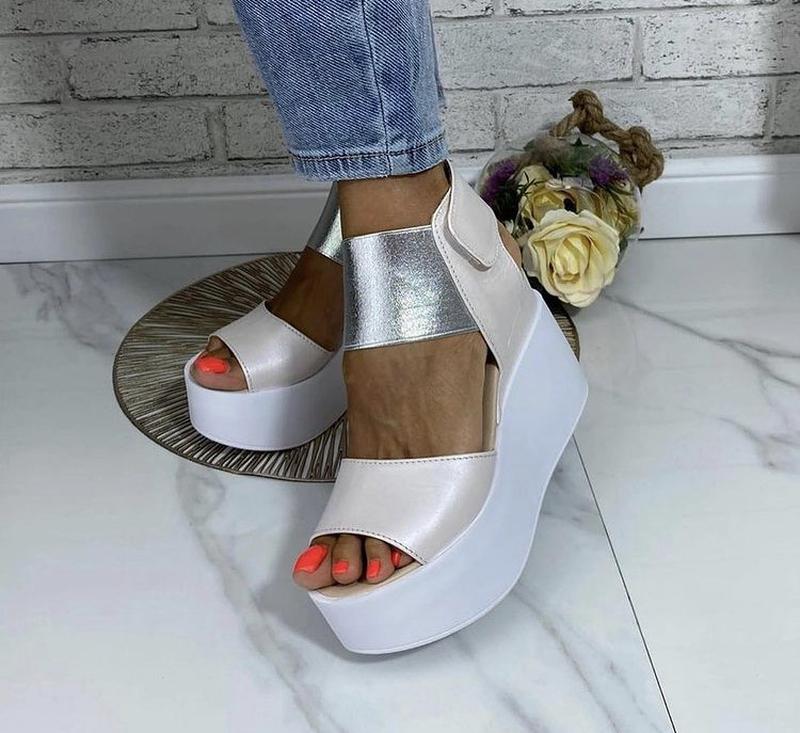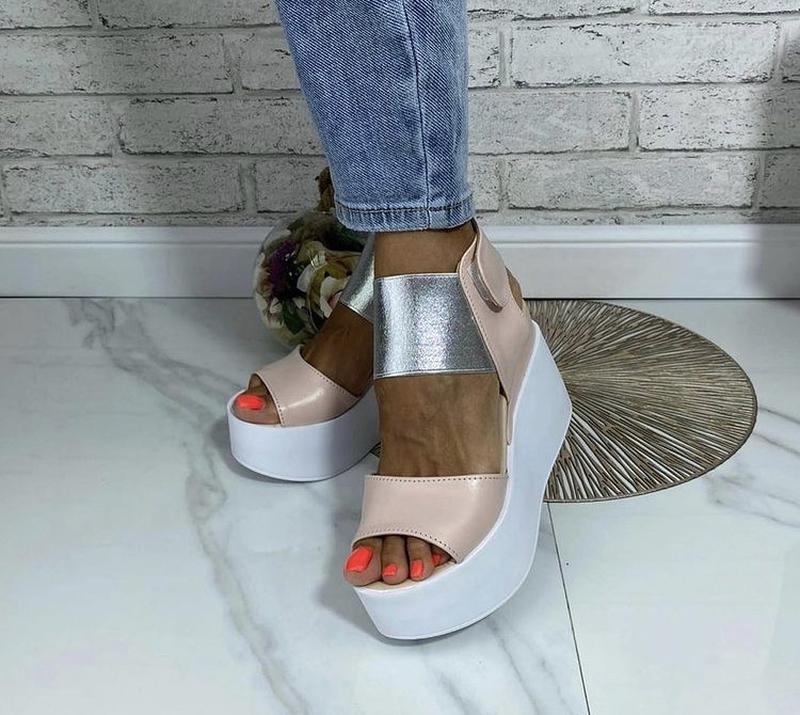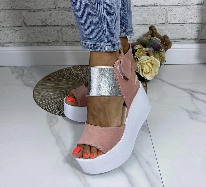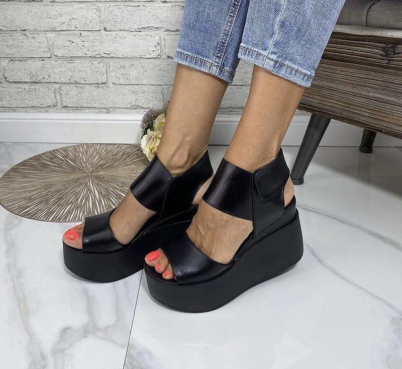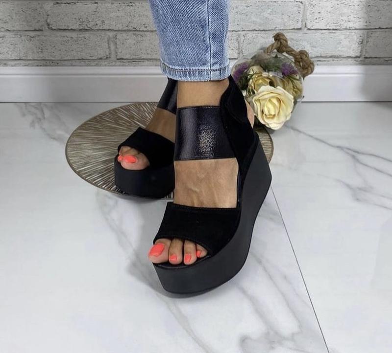 Дуже якісні, шкіряні та замшеві босоніжки на зручній танкетці - ідеально.