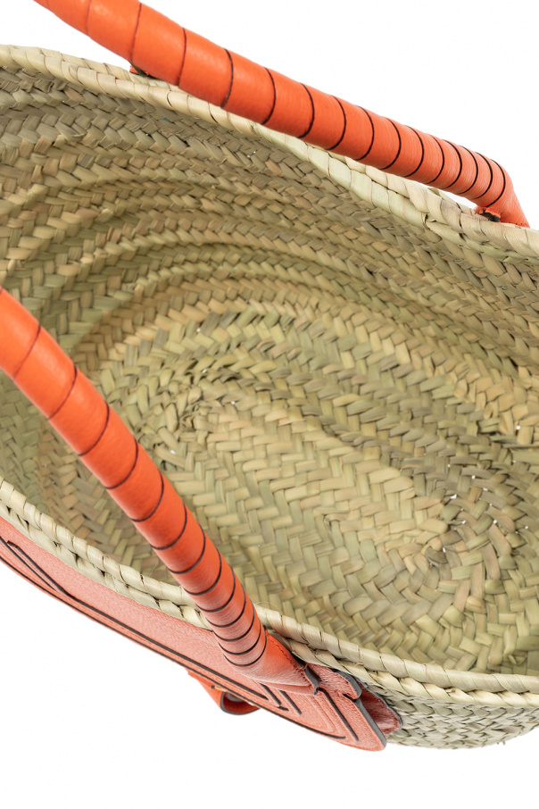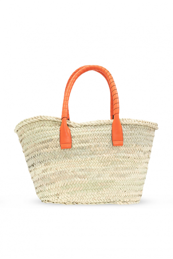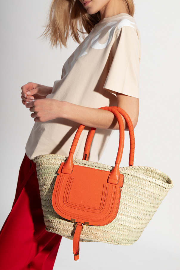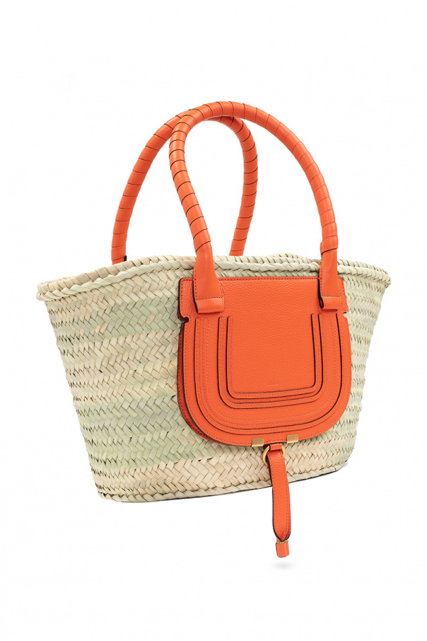 Beige ‘Marcie’ woven shopper bag from Chloé. Trimmed with orange calf leather, this model features decorative stitching details, an embossed logo, a front pocket, two half-round handles, one internal compartment and gold-tone metal hardware.