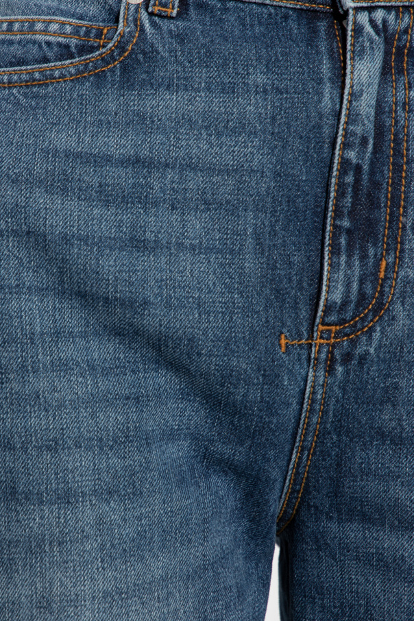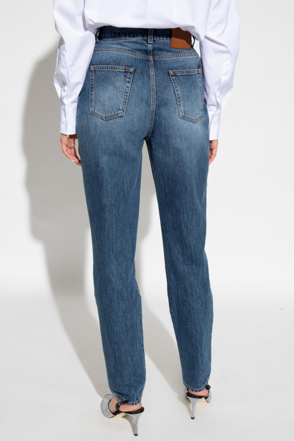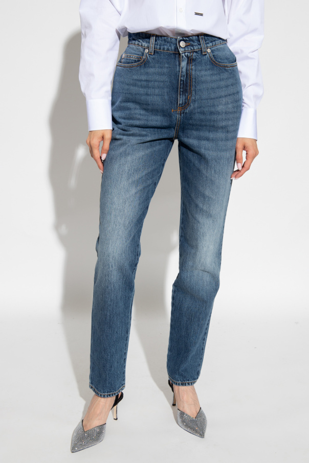 Dark blue jeans from Alexander McQueen. Cut with a high-waisted silhouette, this pair falls with straight legs and features a zip fly with a button, classic five pockets and a logo-embossed leather patch at the back.