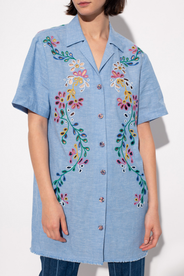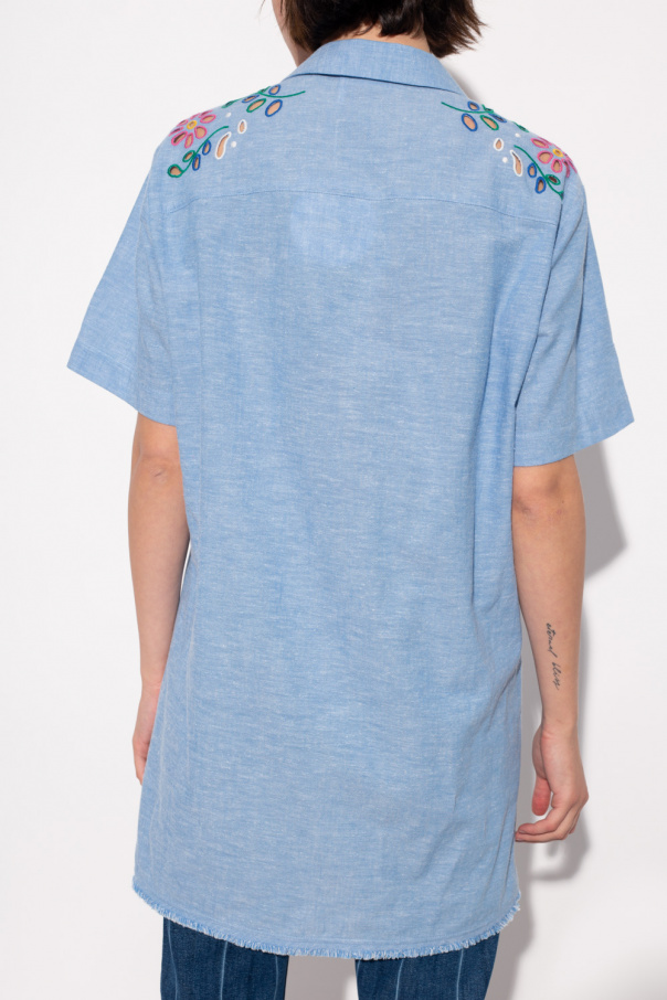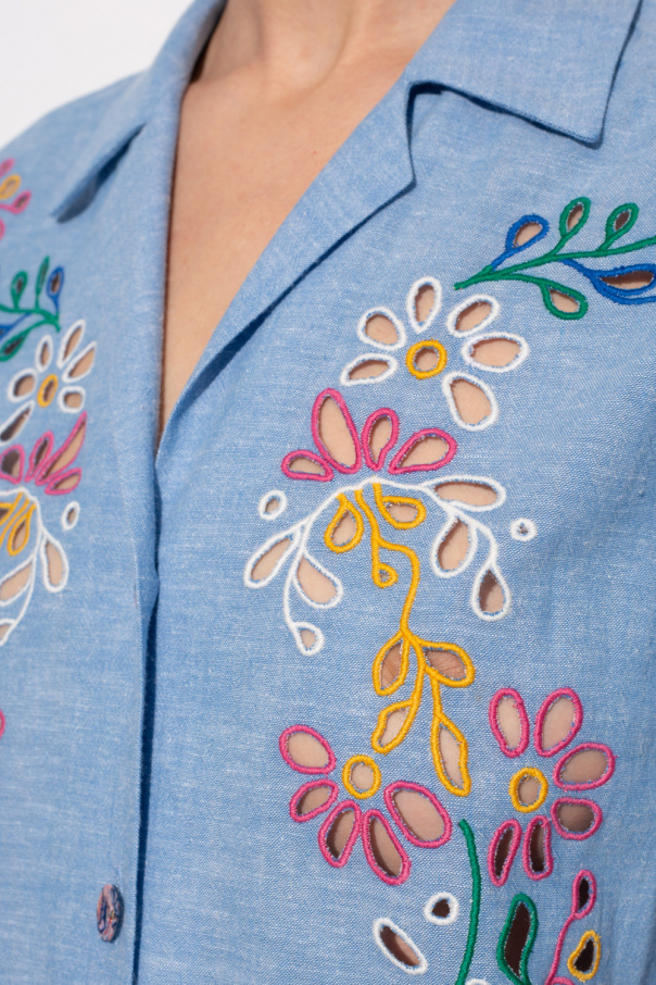 Light blue shirt from Chloé. Crafted from a cotton and linen blend, this style showcases a floral jacquard pattern, colourful button closures, short sleeves and a raw-trimmed hemline.