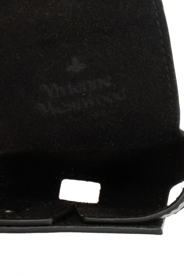 Black AirPod case from Vivienne Westwood. Crafted from leather, this model is complete with a snap fastening, logo appliqué and a removable keyring with a snap hook.