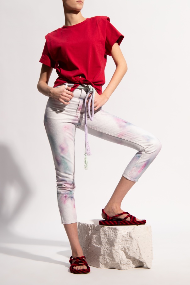 Red and maroon ‘Espa’ sandals from Isabel Marant. This pair rests on a beige and black rubber sole.