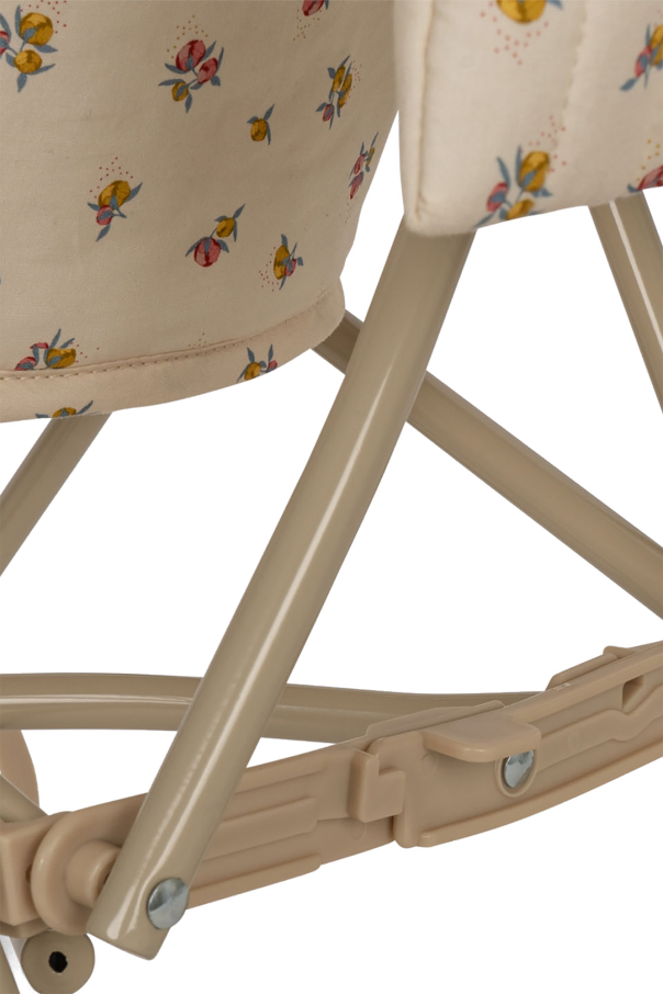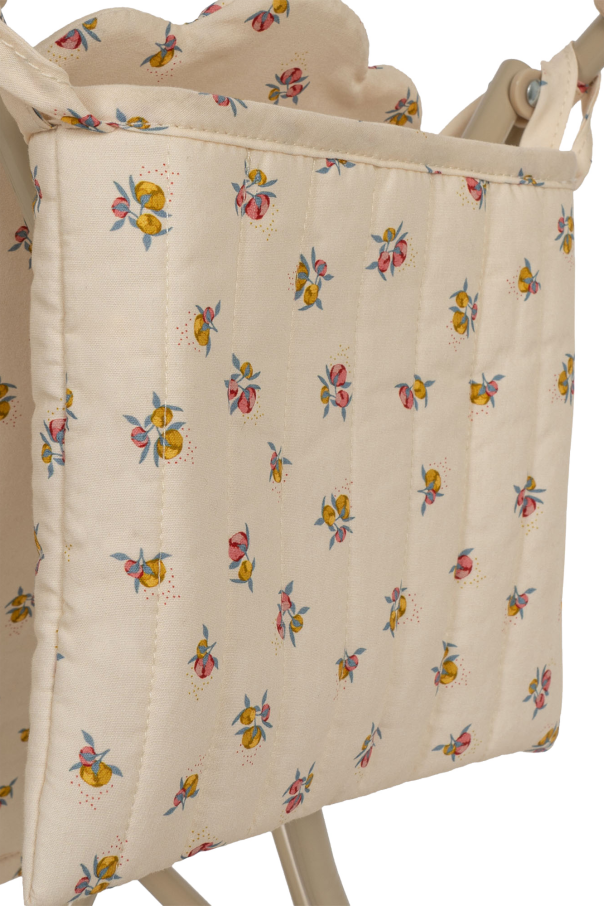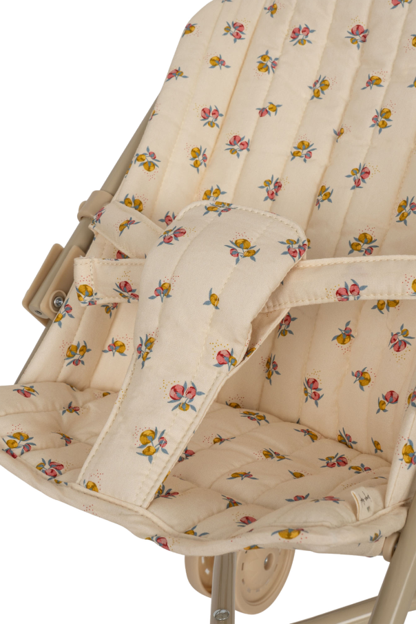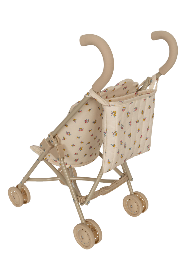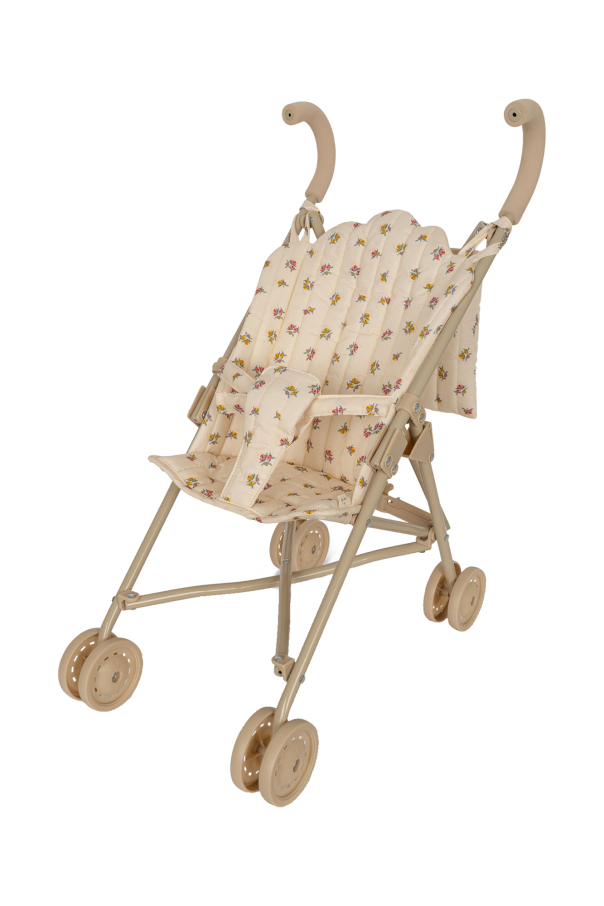 Cream and light beige folding doll stroller from Konges Slojd. The frame is made of iron with spongy soft handles. It is equipped with four large double wheels made in EVA material for extra stability. Comes with a removable seat and carriage bag in floral-printed organic cotton. This item comes fully assembled and is easy to fold and store.