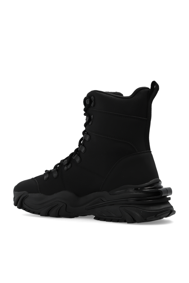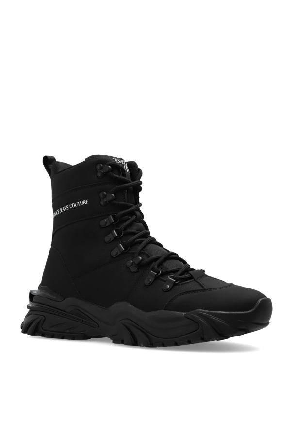 Black trekking boots from Versace Jeans Couture. Printed with the brand\'s logo in white, this high-top model sits on a black rubber sole and showcases lace-up fastenings and a grosgrain pull tab on the back.