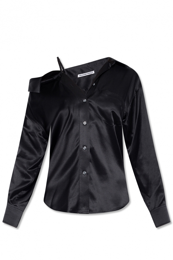 Black shirt from T by Alexander Wang. Made of silk with an asymmetrical silhouette, this style features a denuded shoulder, grey button closures, a slip chest pocket and long sleeves with cuffs.