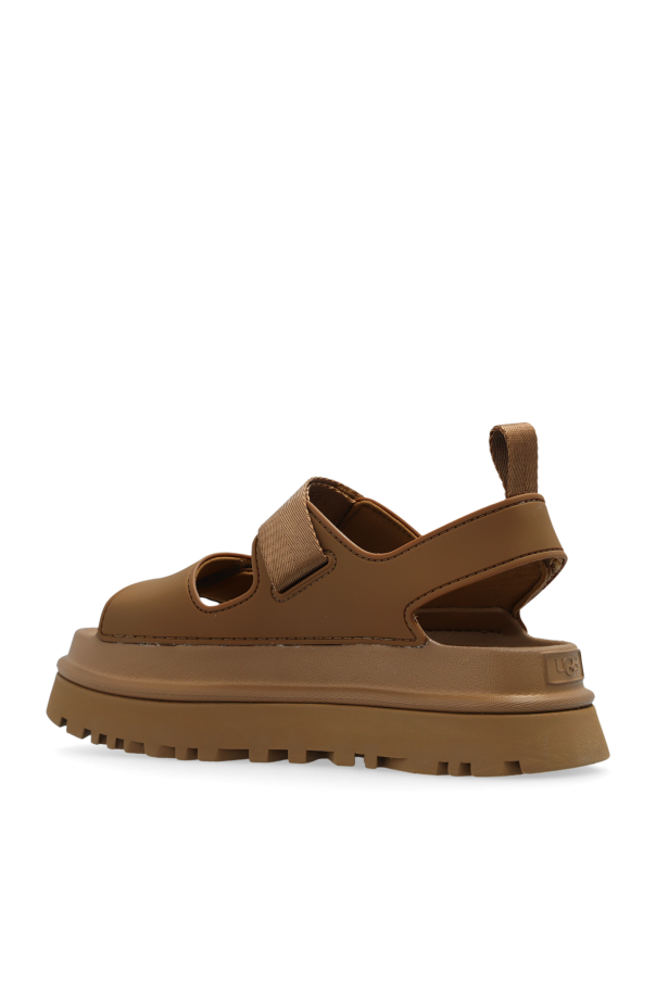 Introducing the \'Goldenglow\' Platform Sandals from the esteemed designer, UGG. These sandals exude a warm hue of brown, offering a perfect blend of functionality and contemporary style. Crafted with a robust rubber outer layer, inner material, and sole, these sandals promise durability and easy maintenance. The thick, flat base features a pronounced tread for superior traction, ensuring each step is secure. The design boasts wide straps that crisscross the midfoot, complete with a Velcro closure for adjustable fit. A subtle designer logo adorns one of the straps, serving as a hallmark of quality and exclusivity. The \'Goldenglow\' sandals are versatile, seamlessly transitioning from casual to elegantly refined summer ensembles, as illustrated by their pairing with wide-checkered trousers in the accompanying photos. Additional imagery provides a comprehensive view of the sandals from various angles, showcasing the material\'s texture, craftsmanship, and the intricacies of the Velcro fastening embossed with the designer\'s logo. The inner lining texture and the construction details are especially highlighted, offering a glimpse into the sandals\' comfort and stylish design. Why Invest in These Sandals? Durable Construction: Crafted from high-quality rubber, designed for longevity and ease of care. Stylish Versatility: Perfect for elevating both casual and elegant summer outfits. Comfort and Security: Features a pronounced tread for excellent grip and a Velcro closure for a customizable fit. Exclusive Design: The discreet designer logo signifies exclusivity and attention to detail.