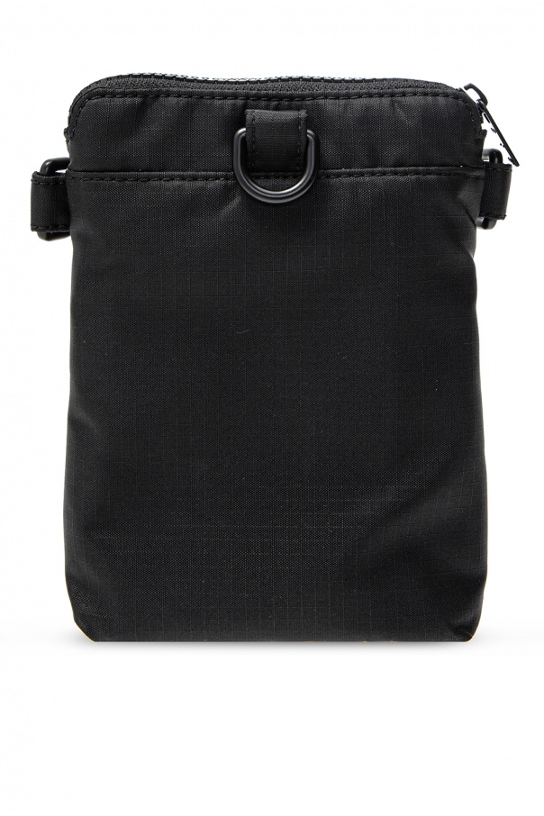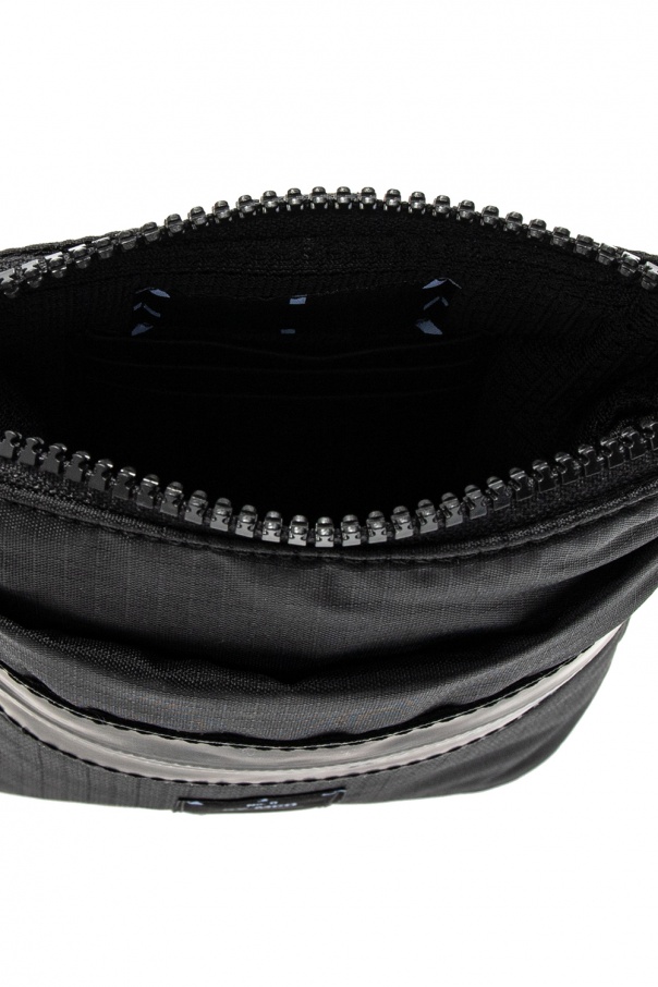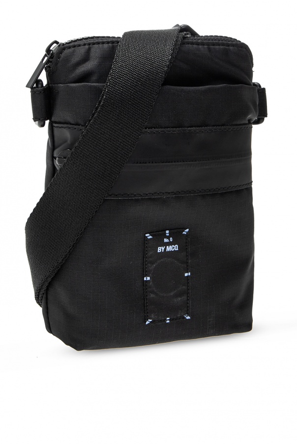 Black shoulder bag from Genesis II by MCQ, the \'No. 0\' collection. Emblazoned with a logo patch, this design fastens via a zip and features a zip pocket and a slip pocket on the front, a detachable and adjustable shoulder strap and one internal compartment with three slip pockets.