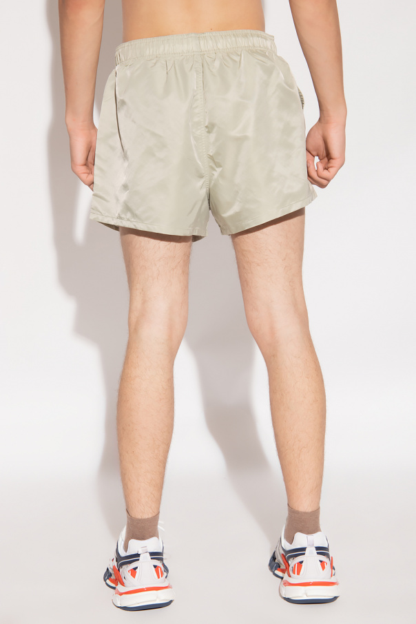 Light green shorts from Fear Of God Essentials. Made of shiny fabric, this pair has an elastic waistband with drawstrings, the brand’s signature rubber logo patch and two slip pockets.