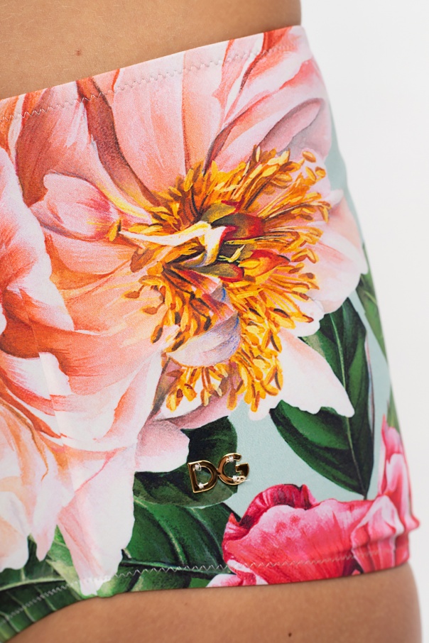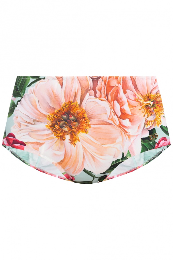 Pink and green swimsuit bottom from Dolce & Gabbana. Illustrated with a floral print, this style features a high-waisted silhouette accentuated with a gold-tone metal logo plaque.
