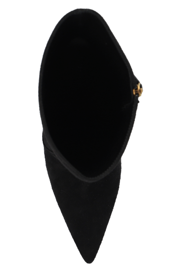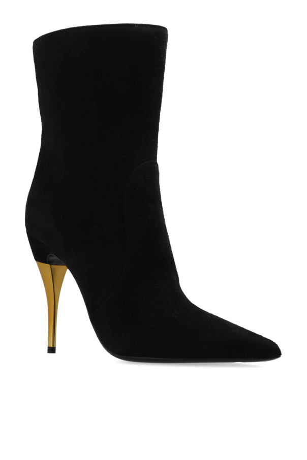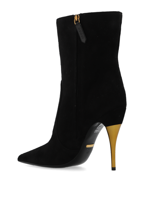Black heeled ankle boots from Gucci. Made of suede, this pair features a side zip, pointed toe, gold-tone heel and black leather sole.