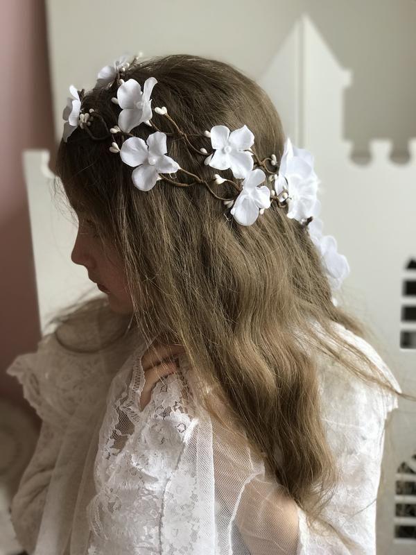Невероятно эффектный и одновременно нежный.Венок сплетенный из проволоки и добавлены гипсовые веточки, цвет белый,украшен цветами из ткани.Жемчужинки пришиты.Смотрится очень нежно и романтично.Веночек делается по Вашему обхвату головы.