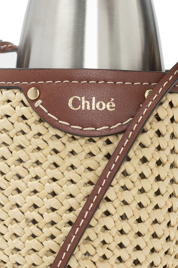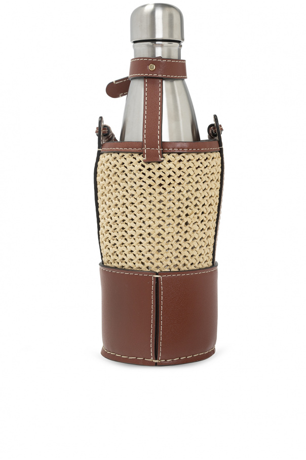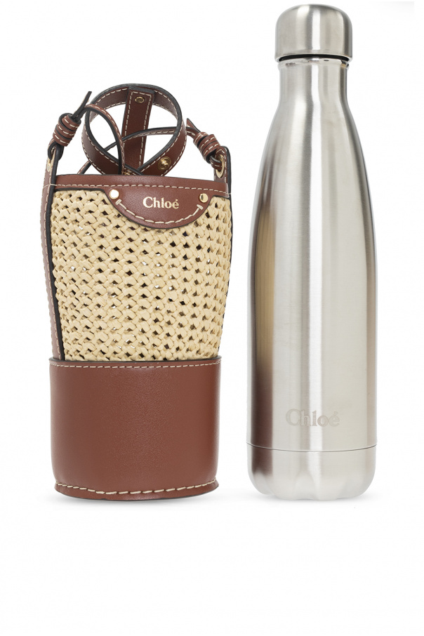 Beige and brown bottle holder from Chloé. Crafted from canvas trimmed with brown calf leather, this design features a logo print and an adjustable shoulder strap. It comes with a silver-tone bottle made of stainless steel.