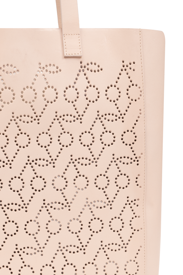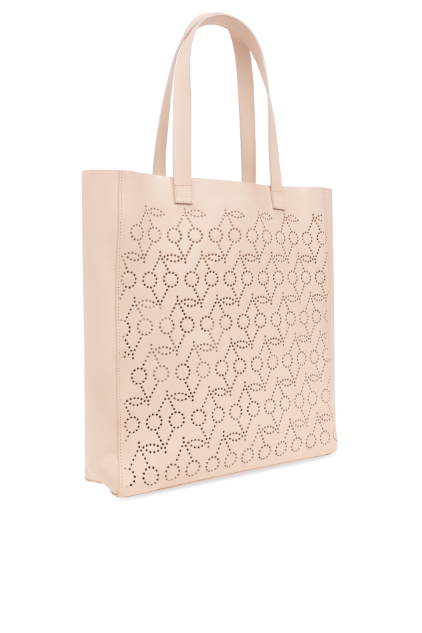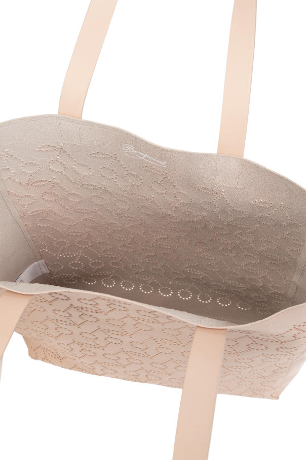Light pink ‘Brune’ shopper bag from Bonpoint. Made from leather, this design showcases a perforated cherry motif, two half-round handles and one internal compartment.