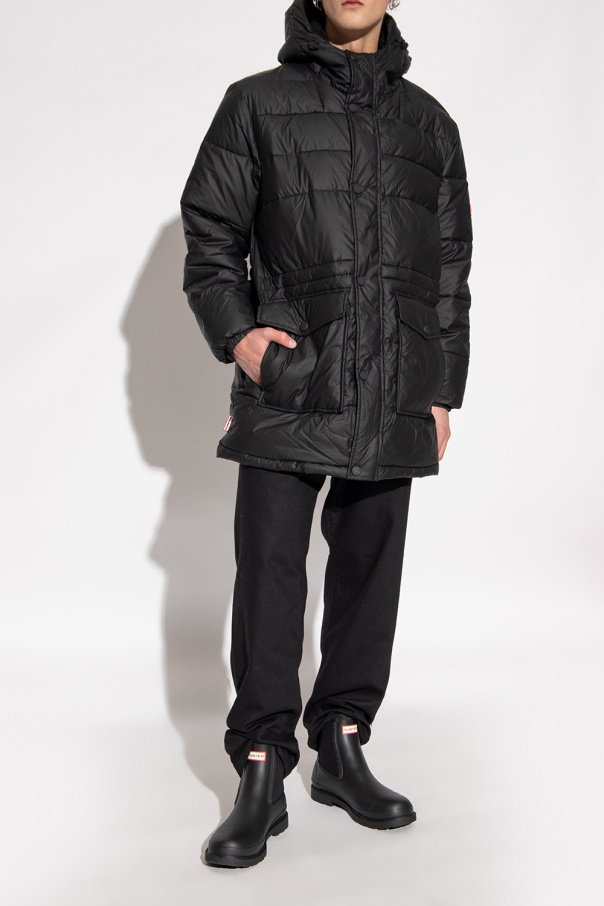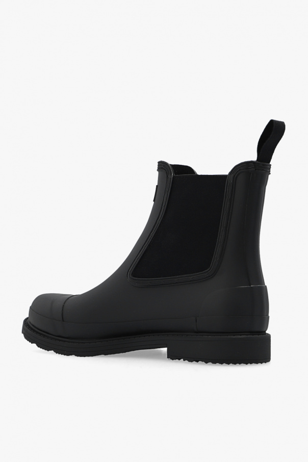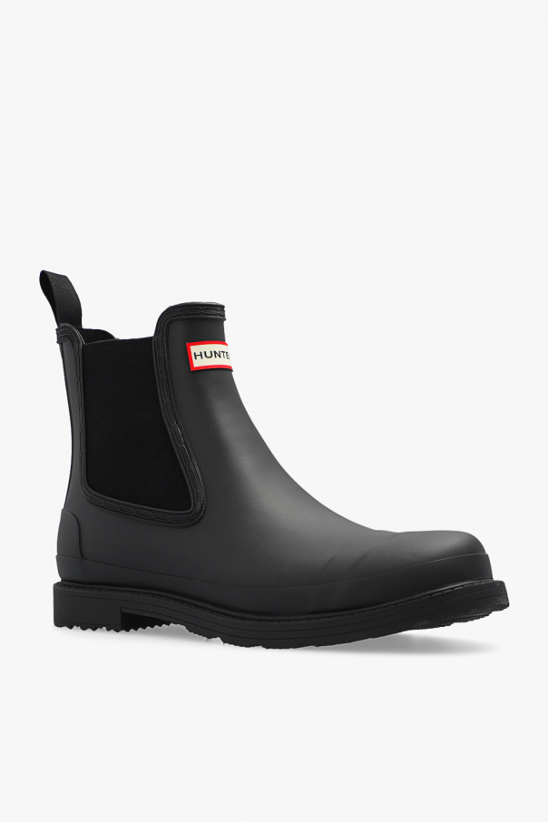Black ‘Commando Chelsea’ rain boots with a matte finish from Hunter. Handcrafted from natural vulcanised rubber from an FSC®-certified plantation, this pair features a logo appliqué, elastic side panels, fabric handle at the back and rubber sole with Hunter Original tread pattern.