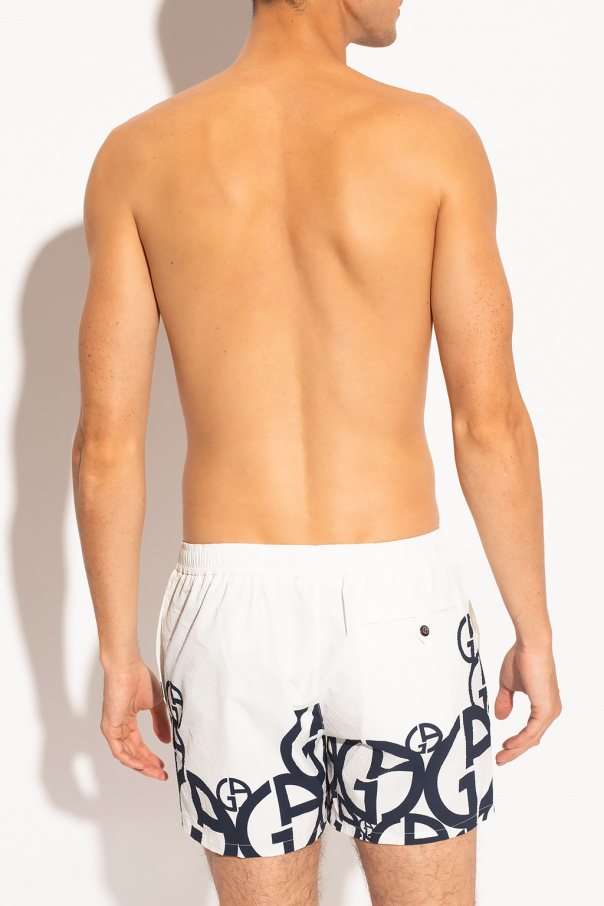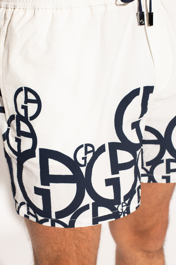 White swim shorts from Giorgio Armani. Fastened with drawstrings, this wide leg design features a navy logo pattern, an elastic waistband, two slip pockets and a buttoned pocket. Comes with a protective pouch.