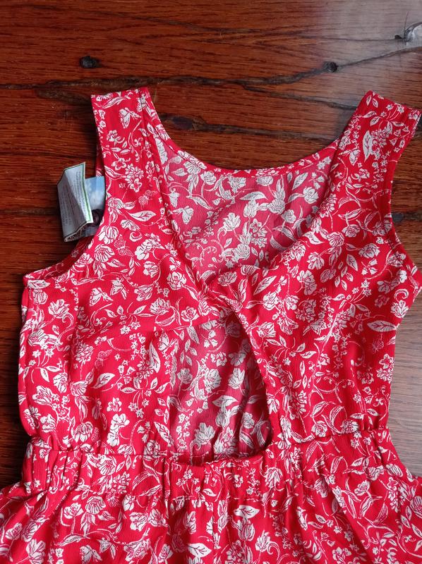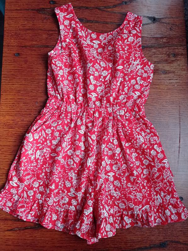 Красивый ромпер красного цвета в цветочный принт.С красивым переплётом на спине.На шортиках рюши.На талии резинка.По бокам карманы.