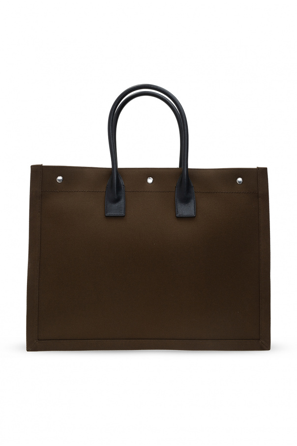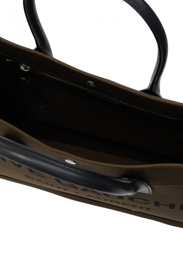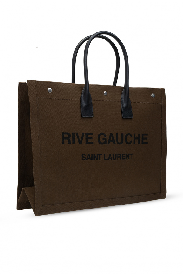 Green and black ‘Noe’ shopper bag from Saint Laurent. Crafted from cotton trimmed with black calf leather, this design fastens with snaps and is decorated with a black logo print. It is complete with two half-round leather handles, capacity increasing snaps on the sides, gold-tone metal hardware and one internal compartment with one zip pocket.