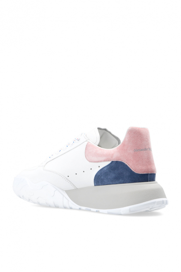 White and grey sneakers from Alexander McQueen. Made of leather, this lace-up pair features a navy and pink suede insert, logo detail and white rubber sole.