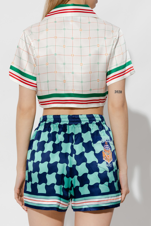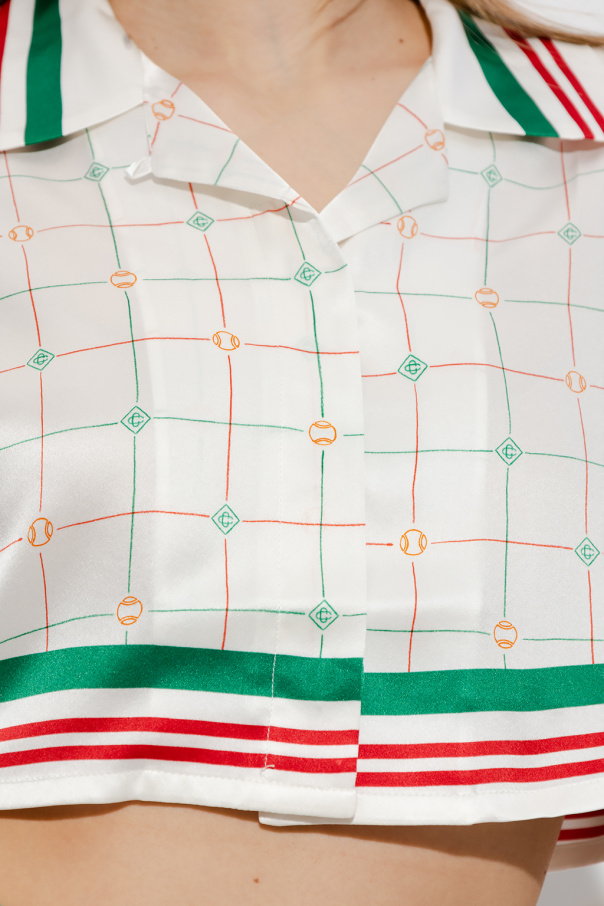 White, green and red shirt from Casablanca. Made of silk with a cropped, relaxed fit, this style fastens with button with a concealed placket and showcases a check pattern accompanied with stripes, a motif of logo and tennis balls and short sleeves.
