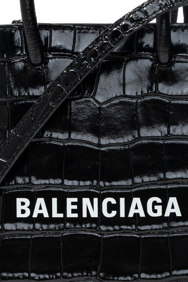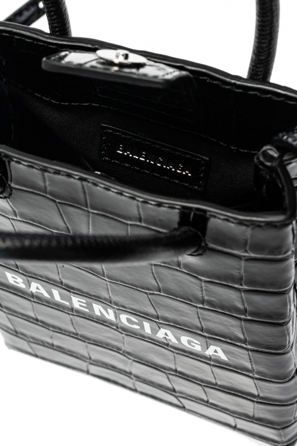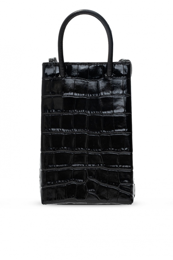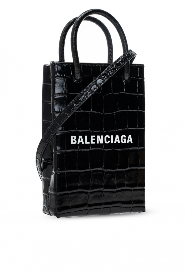 Black ‘Shopping’ smartphone case from Balenciaga. Made of calf leather with a crocodile skin effect, this item secures with a snap and showcases a white logo print on the front, two half-round black handles, an adjustable shoulder strap, silver-tone metal hardware and one internal compartment with one slip pocket.