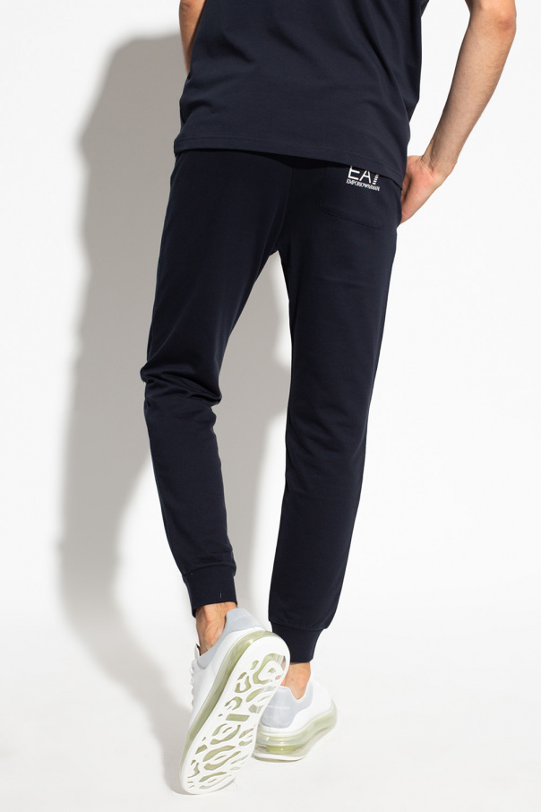 Navy sweatpants from EA7 Emporio Armani. Made of cotton, this design features an elastic waistband with drawstrings, a printed logo pattern in white, three slip pockets and ribbed cuffs.