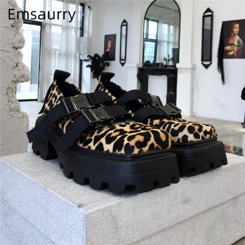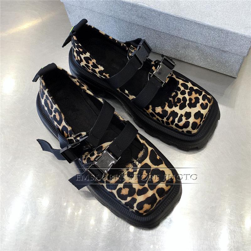 Женские туфли с леопардовым принтом из конского ворса , Туфли Мэри Джейн с пряжкой и квадратным носком, на платформе и толстом каблуке, весенние повседневные туфли
