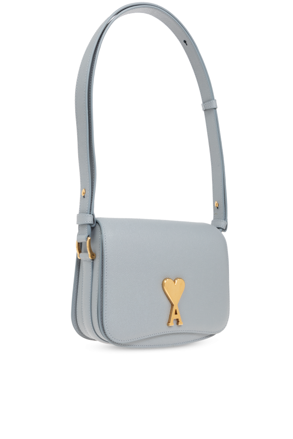 Introducing the epitome of sophistication and functional design—the Logo Shoulder Bag by Ami Alexandre Mattiussi. Crafted with meticulous attention to detail, this accessory is a harmonious blend of luxury and practicality, designed to complement the modern lifestyle. The bag boasts a sleek, rectangular silhouette with softly rounded corners, enveloped in a sumptuous, gray leather exterior. Its surface radiates a subtle sheen, suggesting both opulence and durability. The front flap is adorned with a distinctive, gold heart-shaped logo with the letter \"A\" at its core, immediately signaling the designer\'s trademark elegance. Functionality is not sacrificed for form. The shoulder bag features a long, adjustable strap, facilitating a seamless transition from a shoulder bag to a crossbody, enhancing its versatility. Inside, the bag reveals a spacious main compartment secured by a magnetic snap closure, alongside two slip pockets, ensuring your essentials are organized and within reach. Gold metallic details, including the buckle on the strap, further accentuate the bag\'s luxurious appeal, making it an indispensable accessory for those who covet fashion-forward elegance. Why Purchase This Product? Exquisite craftsmanship from 100% genuine leather. Elegant, timeless design with iconic branding. Versatile carrying options for utmost convenience. Practical interior layout with additional pockets for organization. Perfect fusion of luxury and functionality.