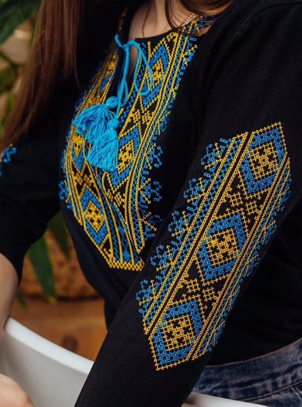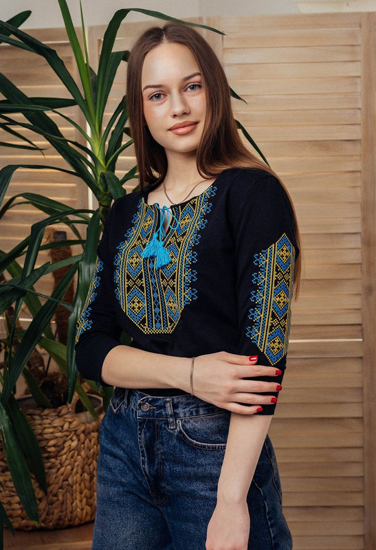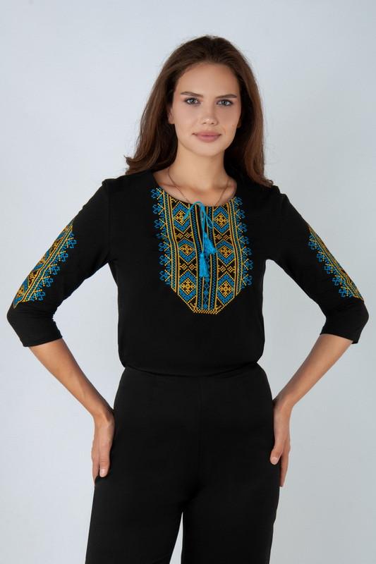 Вышиванка для женщин изготовлена из полотна "Стрейч-кулир пинье". Модель с округлой горловиной, длина рукава 3/4, спереди и на рукавах украшена невероятными узорами, которые вышиты на вышивательной машинке. Такая вещь является актуальной независимо от сезона, статьи или возраста, она отлично комбинируется с брюками или юбками. Вышиванка - неотъемлемый аксессуар каждого украинца.