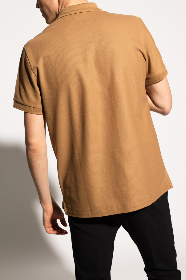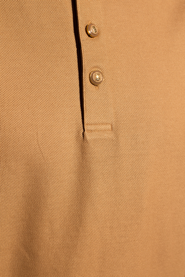 Beige polo shirt from Burberry. Crafted from cotton, this short sleeve design features a collar fastened with logo buttons in gold-tone and side slits.