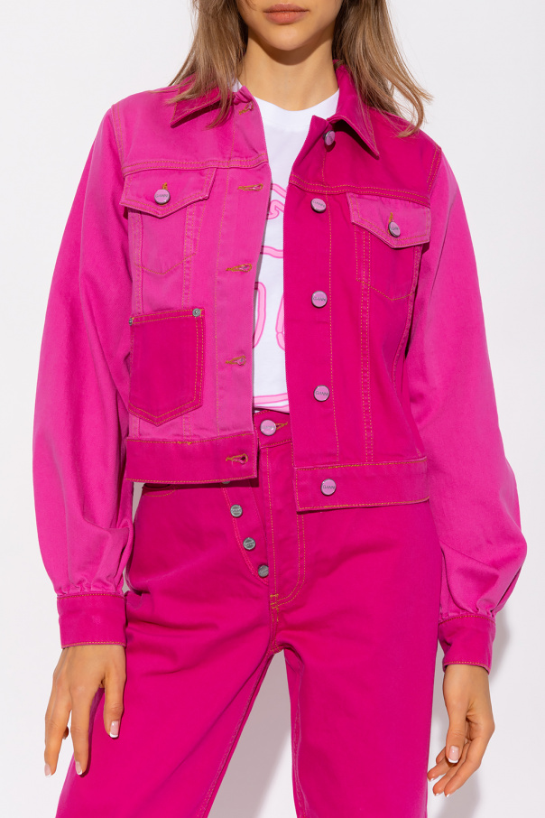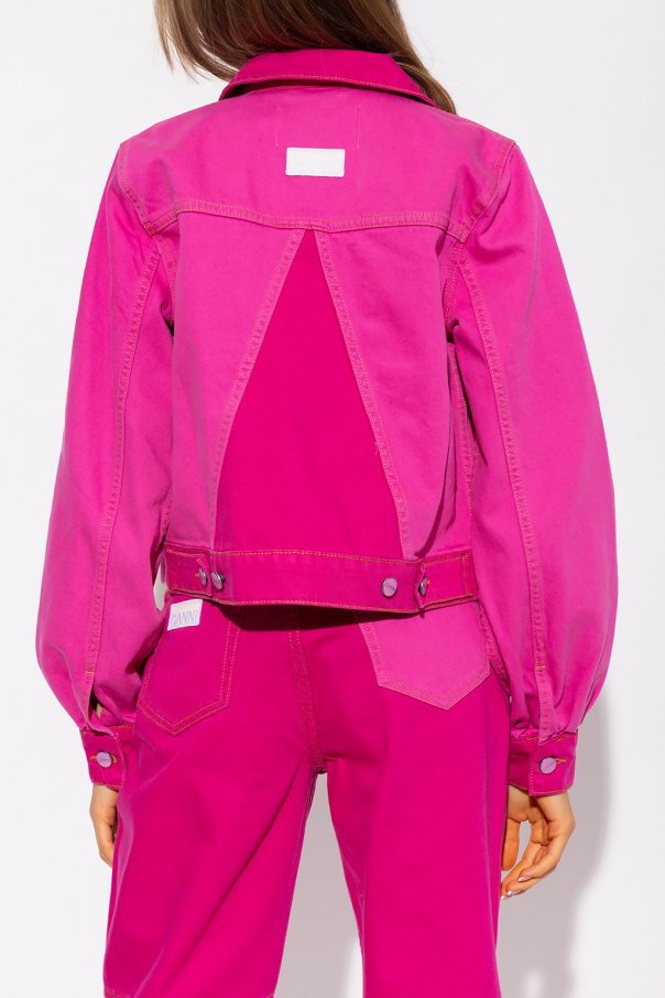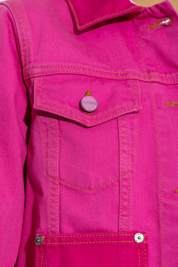 Pink denim jacket from Ganni. Crafted from organic cotton with two shades, this style features button fastenings, two flapped button pockets, one slip pocket, a white logo patch at the back, and long sleeves with button cuffs.