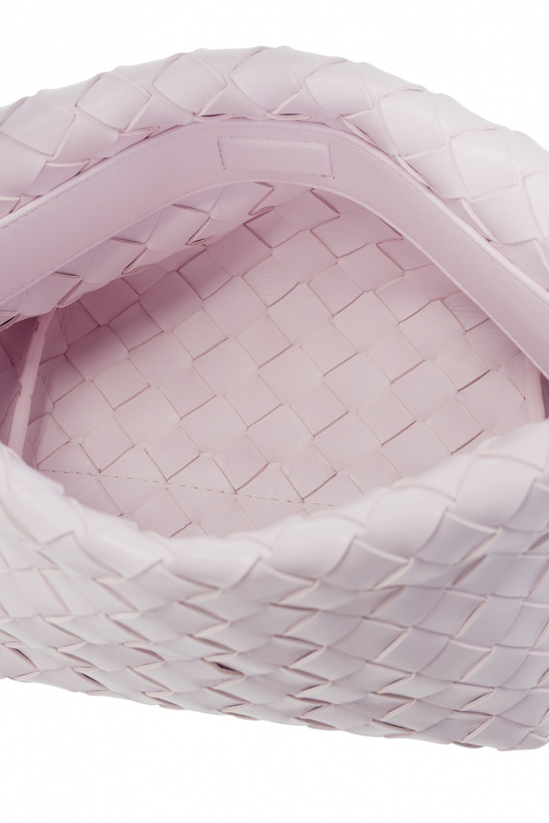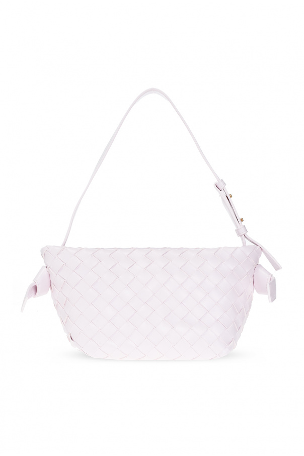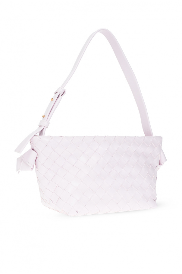 Light pink ‘Tie Small’ shoulder bag from Bottega Veneta. Made of lamb leather with the label’s signature Intrecciato weave, this model features a magnetic snap, short adjustable strap and one internal compartment.