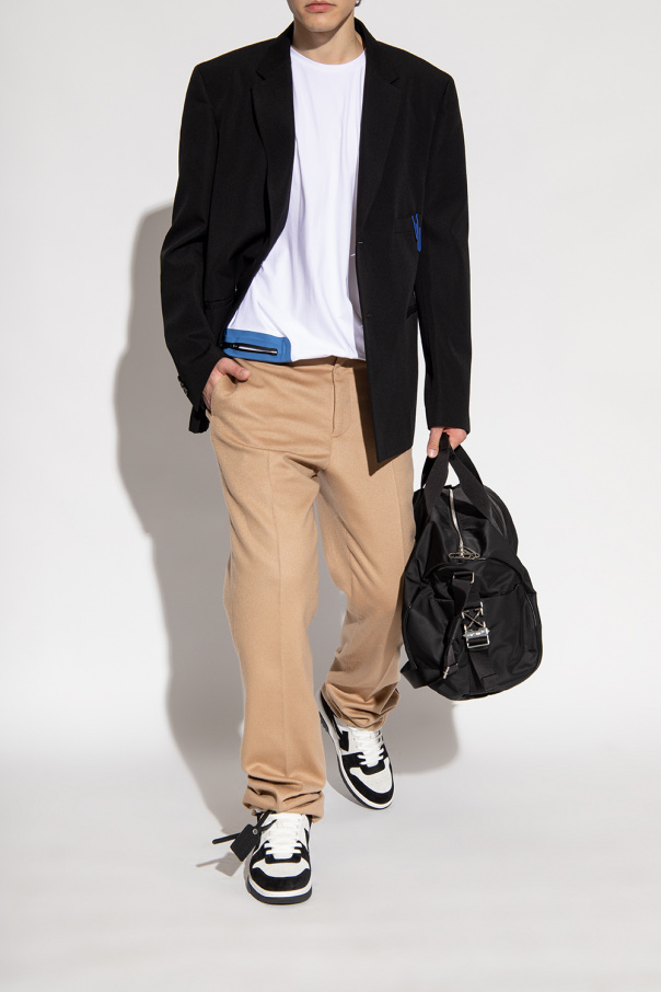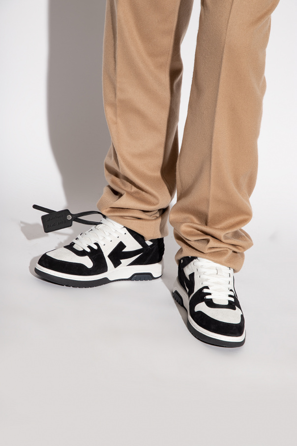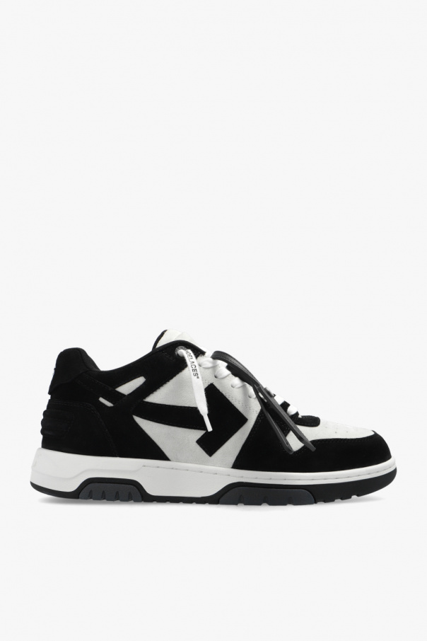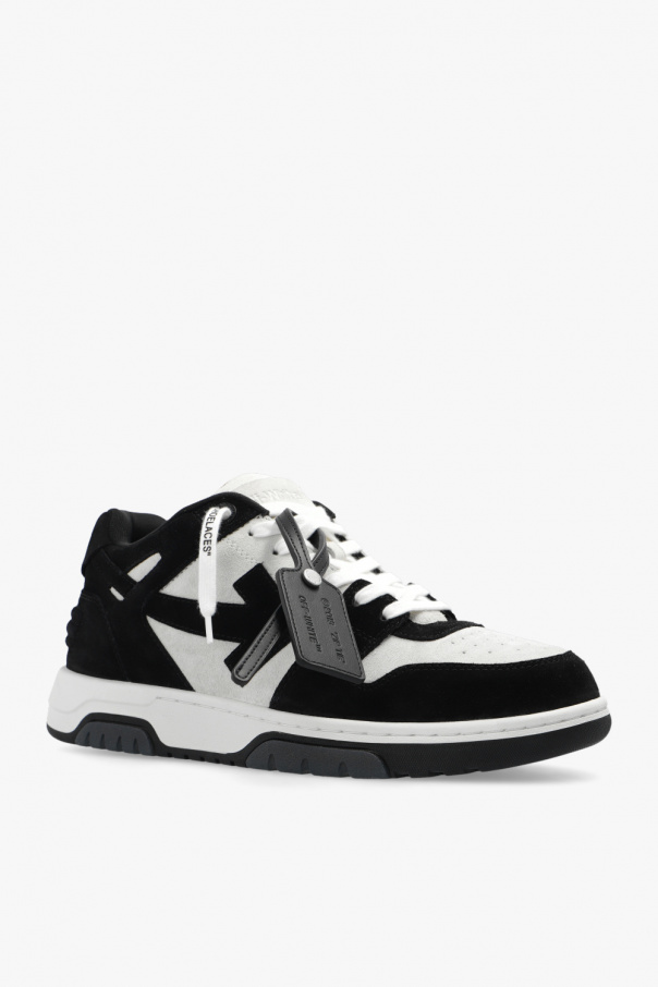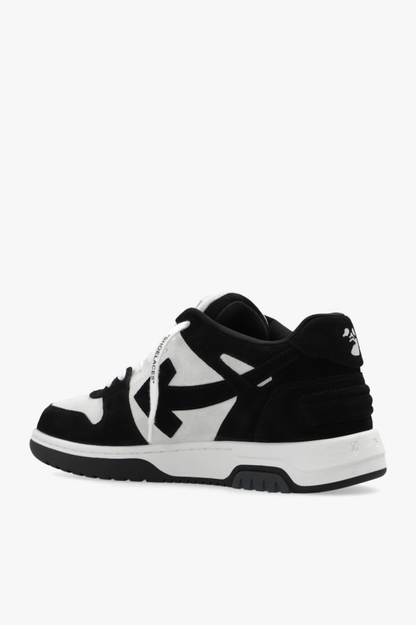 Black and white ‘Out Of Office’ sneakers from Off-White. Made of suede, this lace-up pair features an Arrows patch, the brand’s signature zip tie, perforations and rubber sole in black and white.