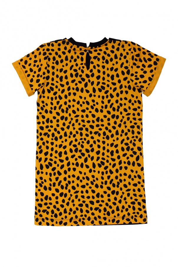 Black dress from Stella McCartney Kids. Illustrated with a yellow, black and white animal print, this cotton-crafted item features a back button fastening, an elasticated round neck and short, rolled-up sleeves.