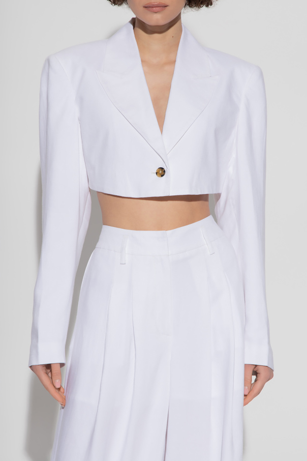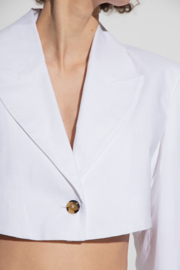 White ‘Loreen’ cropped blazer from Birgitte Herskind. Fastened with buttons, this loose-fitting design features peak lapels, button fastenings and long sleeves.