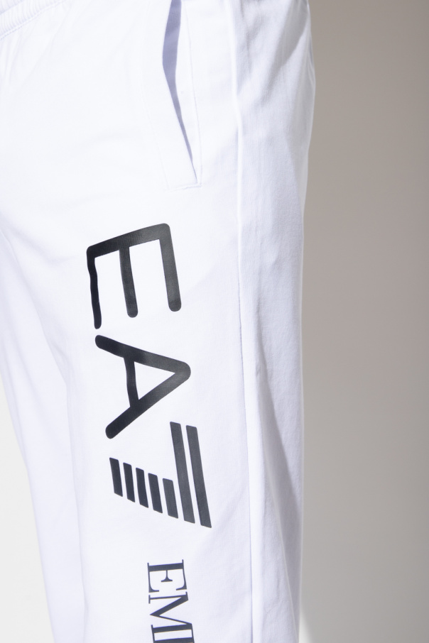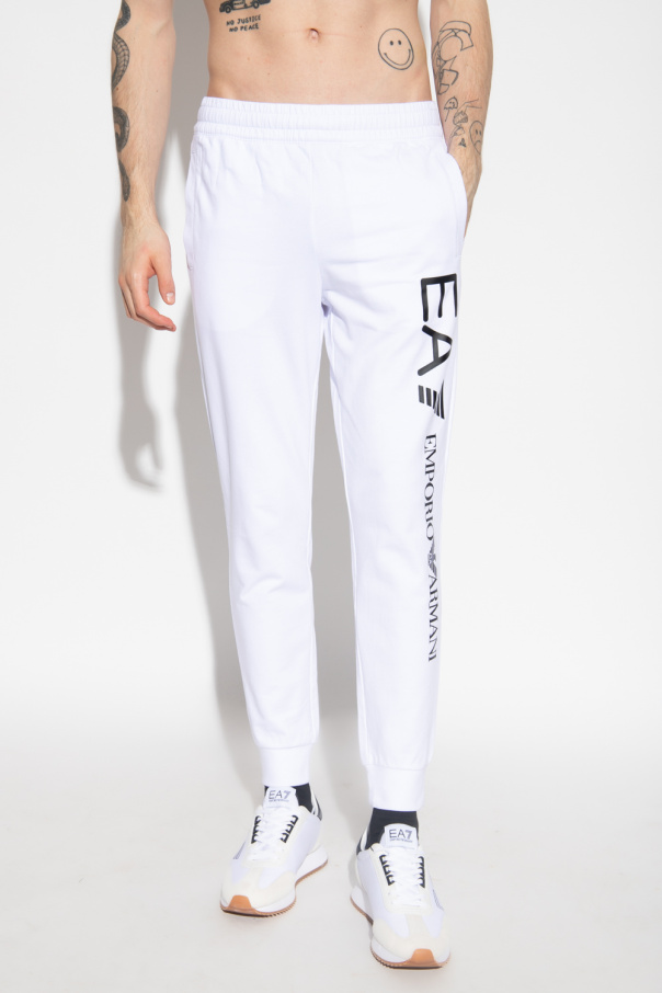 White sweatpants from EA7 Emporio Armani. Made of cotton, this pair features a drawstring waist, black logo print, two front pockets, one back pocket and ribbed cuffs.