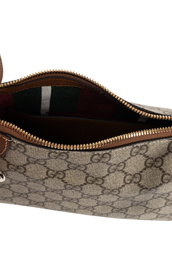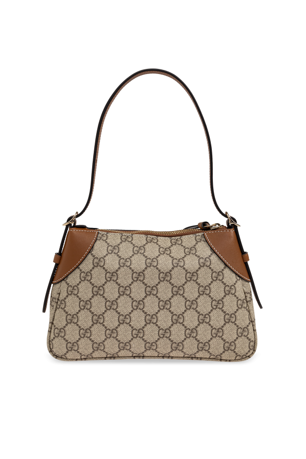 Introducing the ‘GG Emblem Small’ Shoulder Bag from Gucci\'s exclusive collection, a masterpiece of sophisticated design and unparalleled craftsmanship. This exquisite bag boasts a rectangular shape with gracefully rounded edges, adorned in a refined beige hue with the iconic \"GG\" pattern, a signature hallmark of the renowned brand. Meticulously crafted from premium canvas with luxurious brown leather accents on the corners and strap, this bag exudes elegance. The adjustable strap is embellished with the brand\'s distinctive green and red hues, infusing a touch of classic allure. Attention to detail is evident in the round metal ring and secure zip closure, ensuring your essentials are stylishly safeguarded. Inside, the bag features a dark-toned lining, a spacious compartment, and a slip pocket for organized storage. Why Choose This Product? Distinctive design with Gucci\'s iconic \"GG\" pattern. Premium canvas and leather construction. Adjustable strap with classic brand colors. Practical interior with a zip closure and slip pocket. Embodying the innovative spirit of creative director\'s vision.