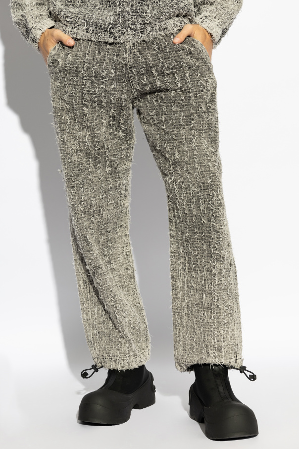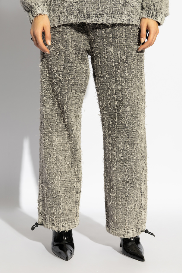 Introducing the ‘D-MARTIAL-S2’ Trousers from the esteemed Diesel collection, a masterful blend of elegance and functionality. Crafted from luxurious gray cotton with a boucle-like texture, these trousers exude a sophisticated yet raw aesthetic, with subtle threads elevating their unique charm. The loose, straight cut accentuates a casual allure, while adjustable cuffs with drawstrings at the hem allow for a personalized fit. Thoughtful design details include two side pockets, enhancing practicality, and a waistband that cinches with drawcords for added comfort. Highlighted in the accompanying images, the trousers are styled with complementary wardrobe pieces, achieving a cohesive, modern ensemble. Designed as a unisex piece, these trousers transcend gender norms, offering a versatile addition to any daily attire. Why Choose This Product? Exclusive boucle-textured cotton for a unique look. Adjustable hem and waistband for a customized fit. Functional side pockets enhance everyday utility. Unisex design for versatile styling options.