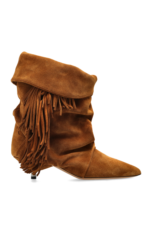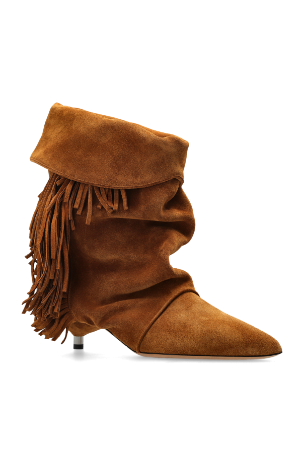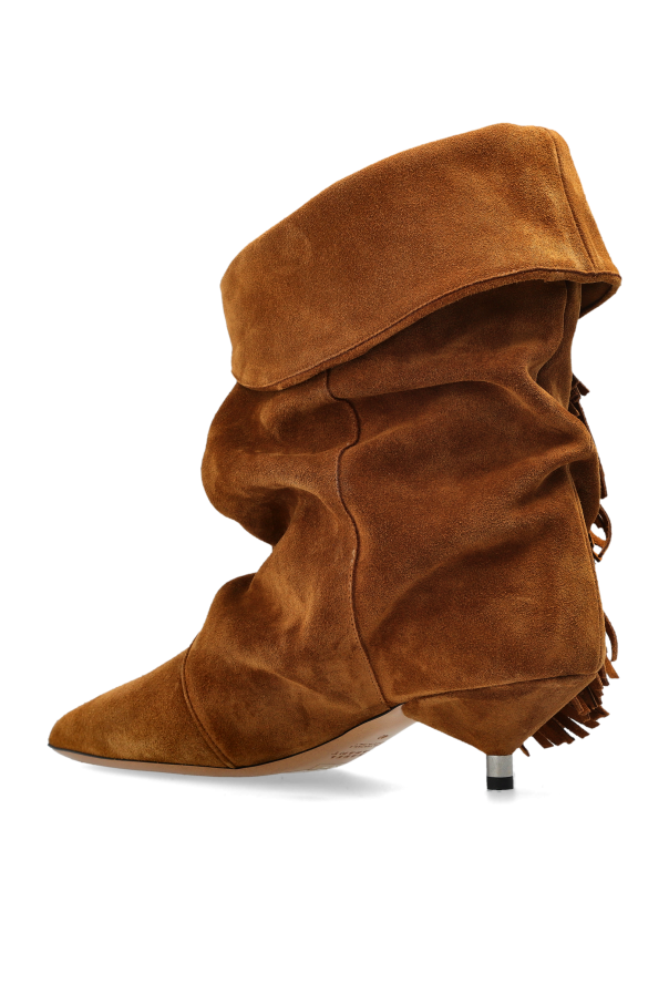 Introducing the exquisite Edrik knee-high boots, a sublime creation by the visionary designer Isabel Marant. These refined boots, crafted from luxurious suede, exude an air of elegance and sophistication. The distinctive ruched shaft, complemented by a chic fringe embellishment, adds a touch of dynamic flair, making these boots a versatile choice for both elegant and casual ensembles. With a sleek pointed toe and a narrow, medium-height heel, the Edrik boots are a testament to Marant\'s signature blend of timeless sporty elegance and effortless style. The wide collar at the top of the shaft further accentuates their unique design, while the predominant brown hue ensures they remain a versatile addition to any wardrobe. Why Choose These Boots? Luxurious suede exterior for an elegant appearance. Chic fringe detailing for a modern and dynamic look. Designed to complement both sophisticated and casual outfits. Wide collar and ruched shaft for added style. Crafted by the renowned designer Isabel Marant.