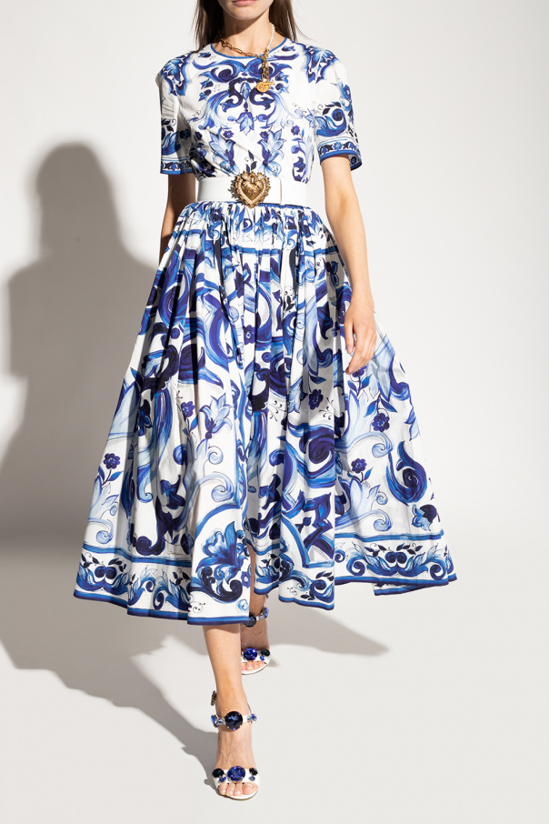 White and blue ‘Keira’ heeled sandals from Dolce & Gabbana, the ‘Blu Mediterraneo’ collection. Made of patent leather, this pair is complete with an adjustable strap with a decorative buckle, stones of different sizes and colors, decorative heel with a floral motif inspired by majolica tiles and navy leather sole.