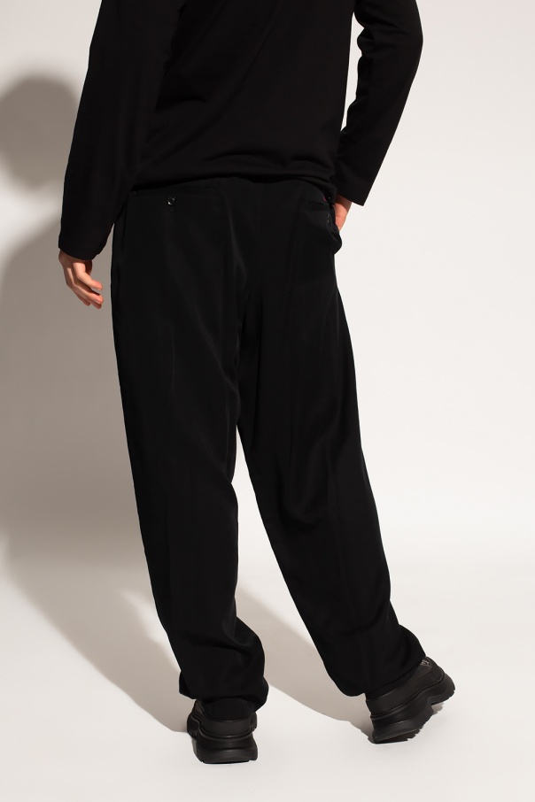 Black trousers from Yohji Yamamoto. Fastened with a zip, this straight leg design features a zip fastening, elastic waistband with drawstrings, two slip pockets and two zip pockets.