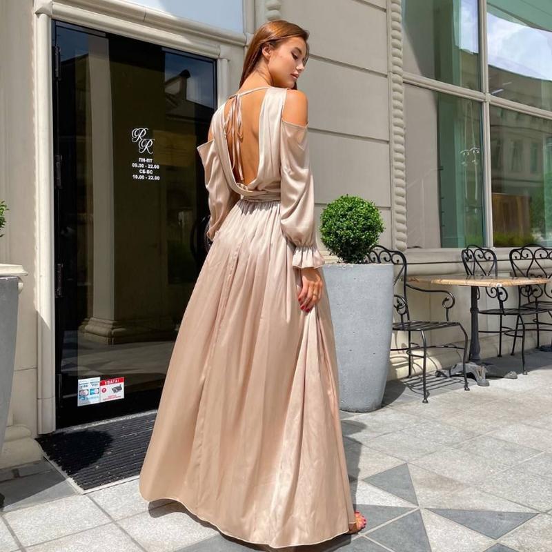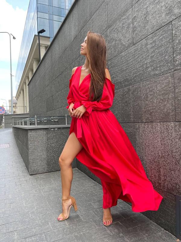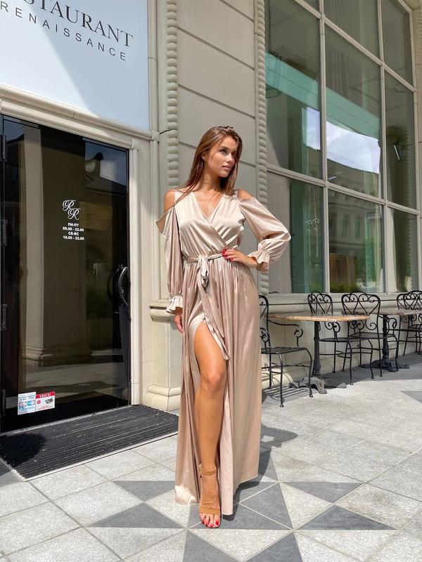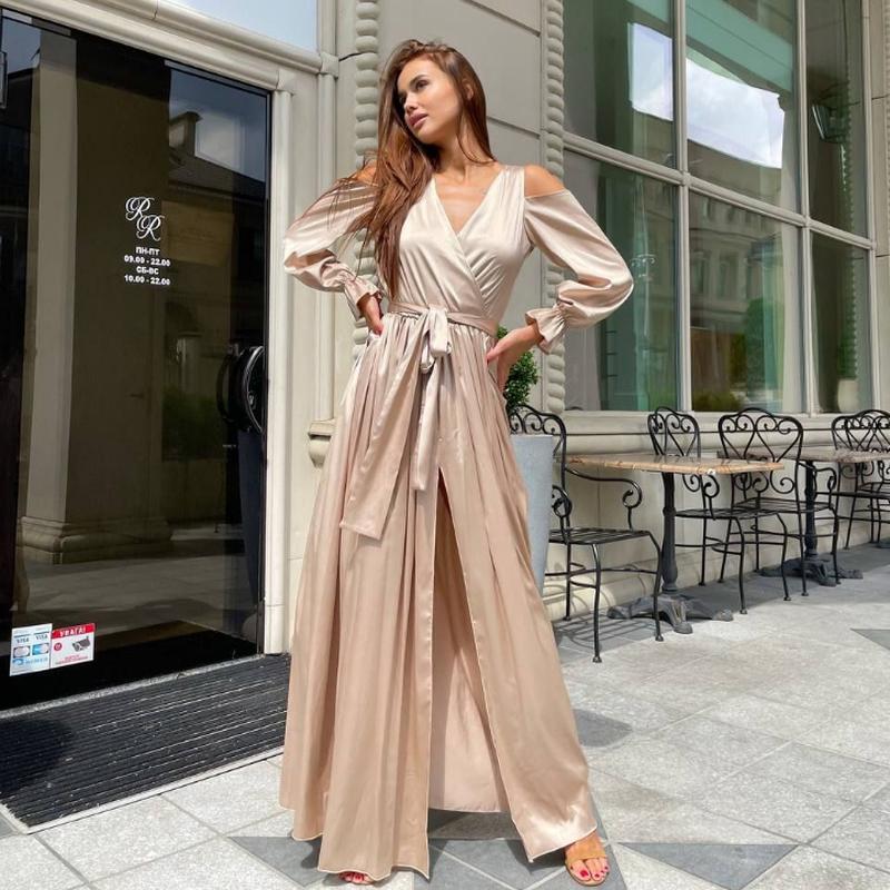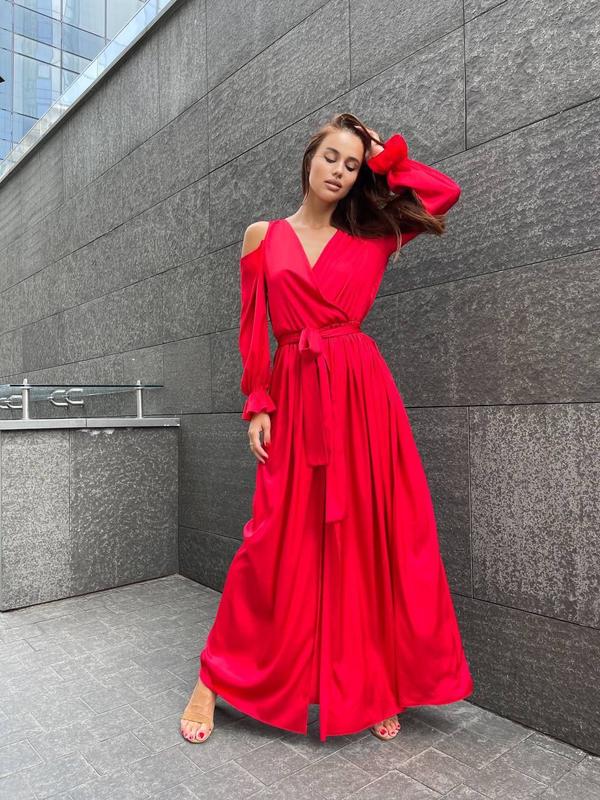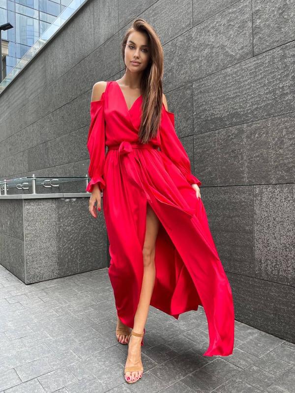 Волшебное шелковое платье на запах. V-образный вырез на спине, обнаженные плечи, глубокое декольте, и не менее привлекательный разрез - чего еще можно желать! Объемные рукава с манжетами на резинке, талия регулируется поясом.